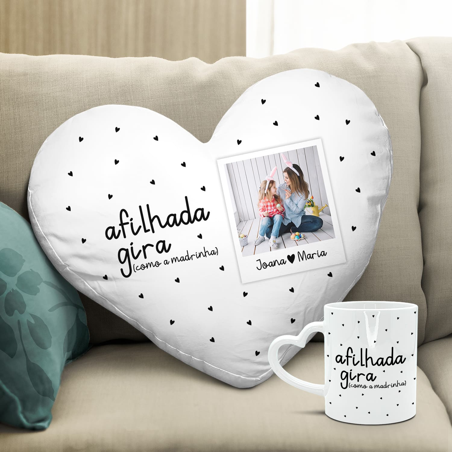 Surpreenda com este conjunto almofada e caneca personalizado.