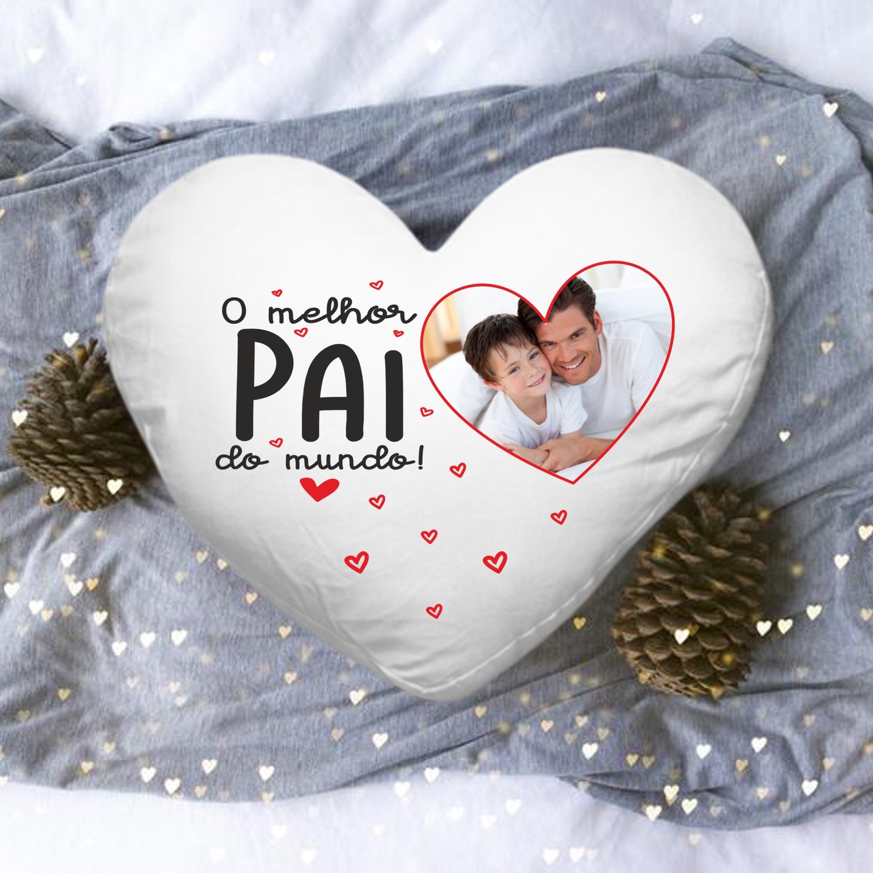 A almofada coração "O melhor pai do mundo" é personalizada com fotografia. Poderá ainda personalizar com o grau de parentesco pretendido (ex.: "pai", “avô”, “genro”, “marido”, “filho”, “sogro”, …).