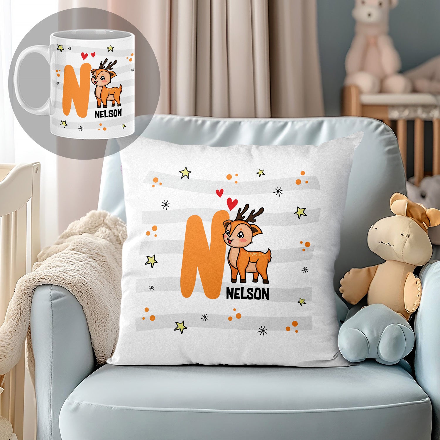 O conjunto almofada e caneca "Alfabeto - Animais" é personalizado com inicial e nome.