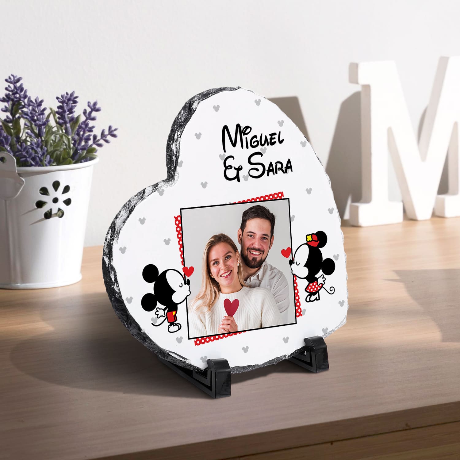 A ardósia coração "Apaixonados" é personalizada com nome(s) e fotografia.