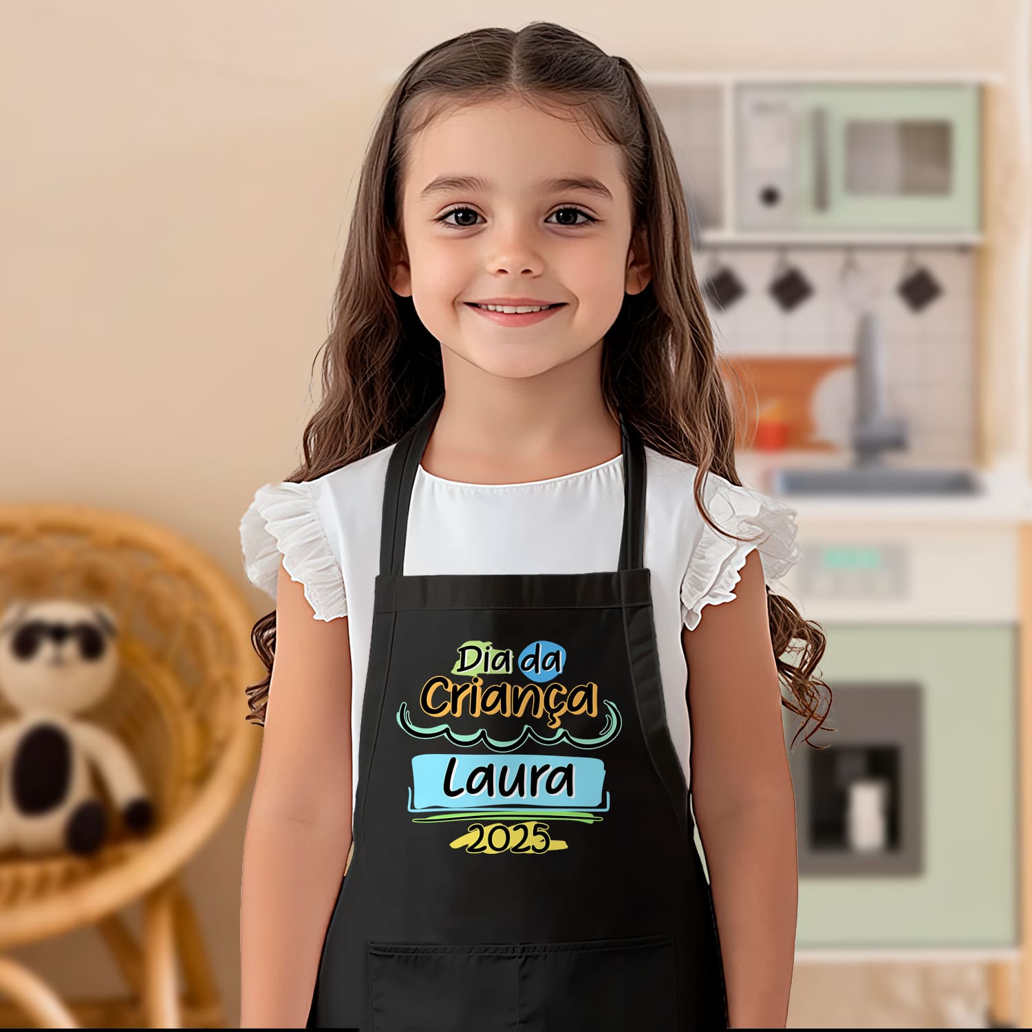 O avental "Dia da Criança" é personalizado com nome e ano.