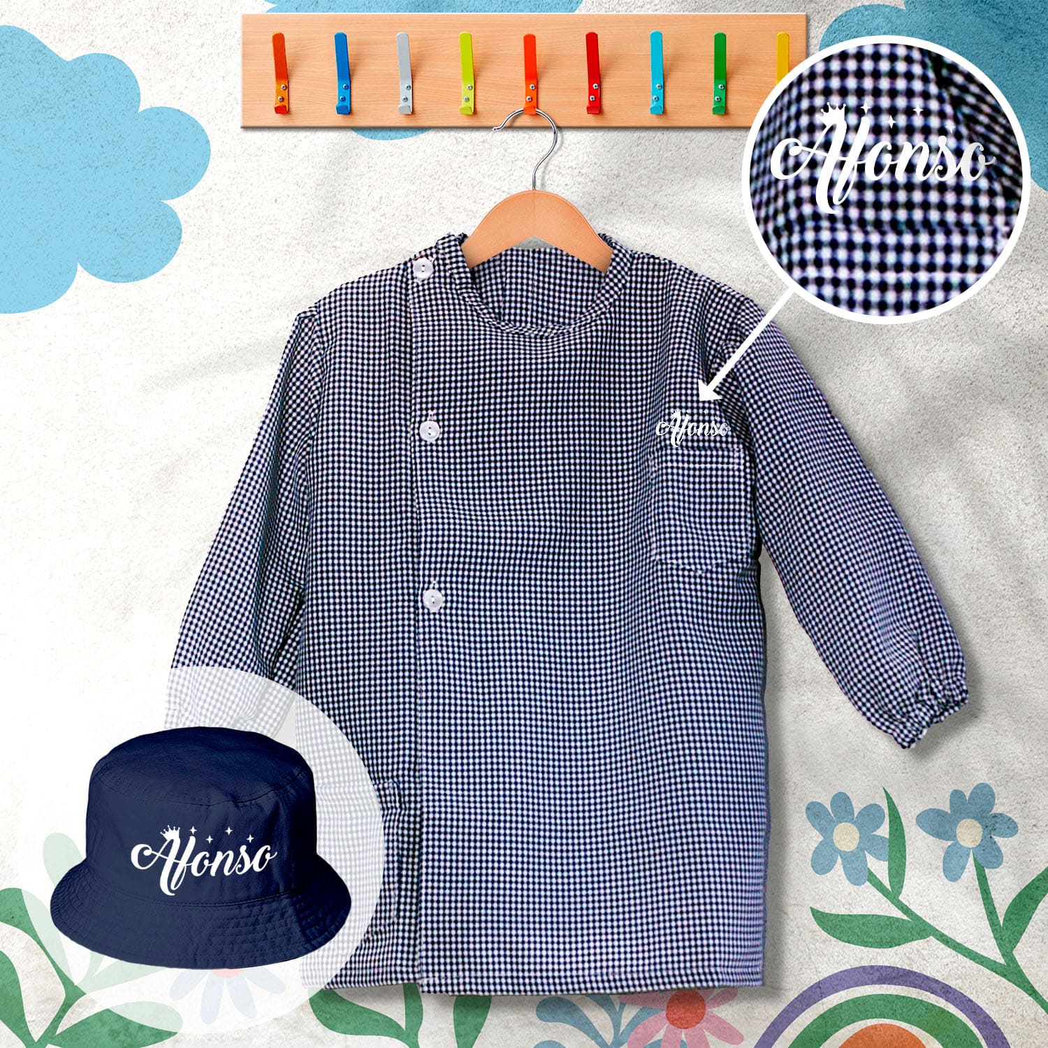 A bata escolar e o panamá "Nome Coroa" são personalizados com nome.