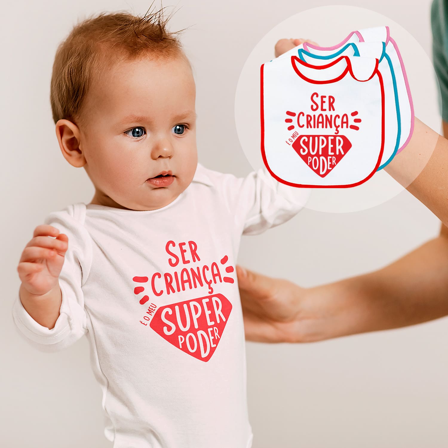 O body e o babete "Ser criança é o meu super poder" são personalizados com nome.