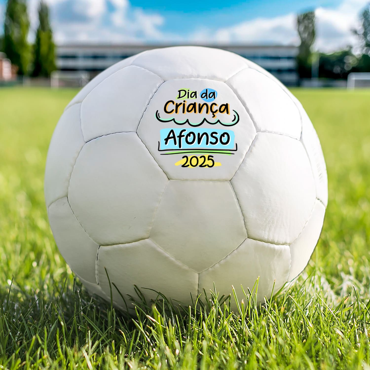 A bola "Dia da Criança" é personalizada com nome e ano.