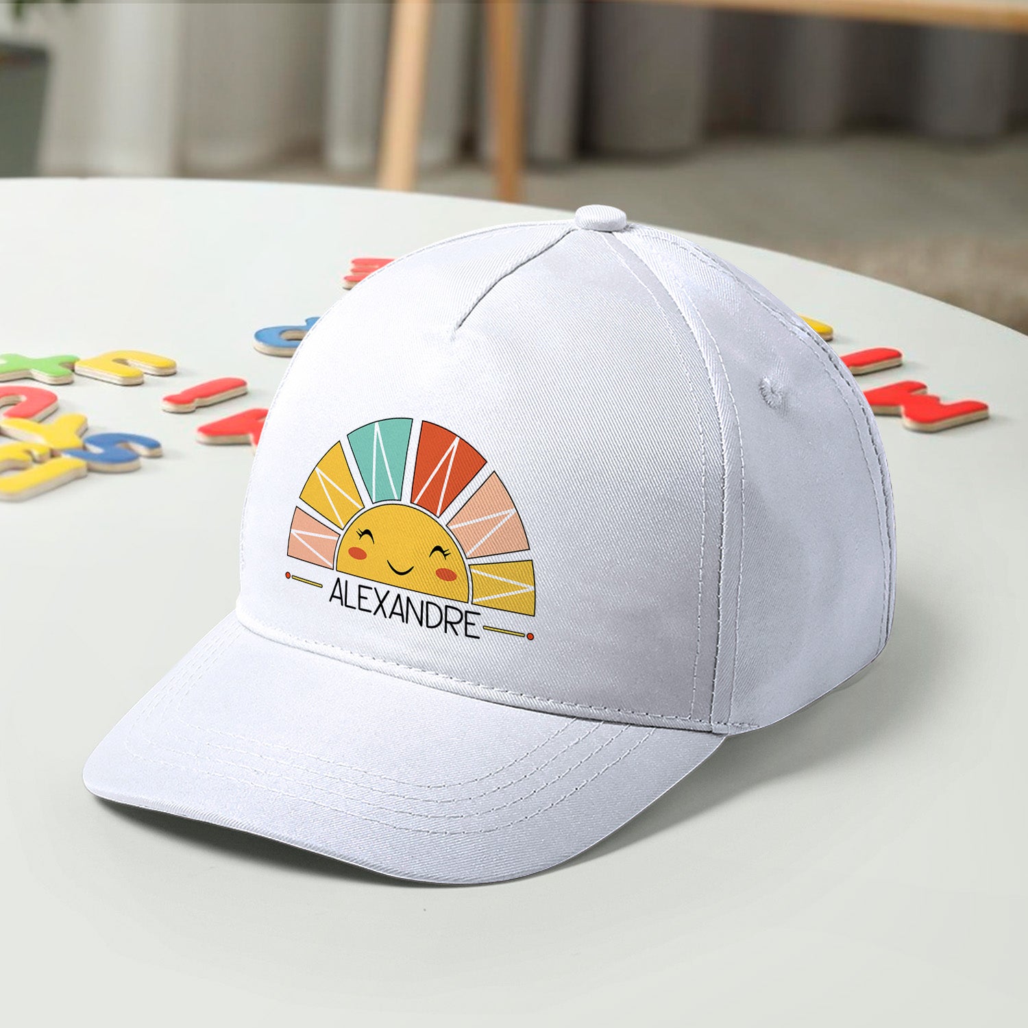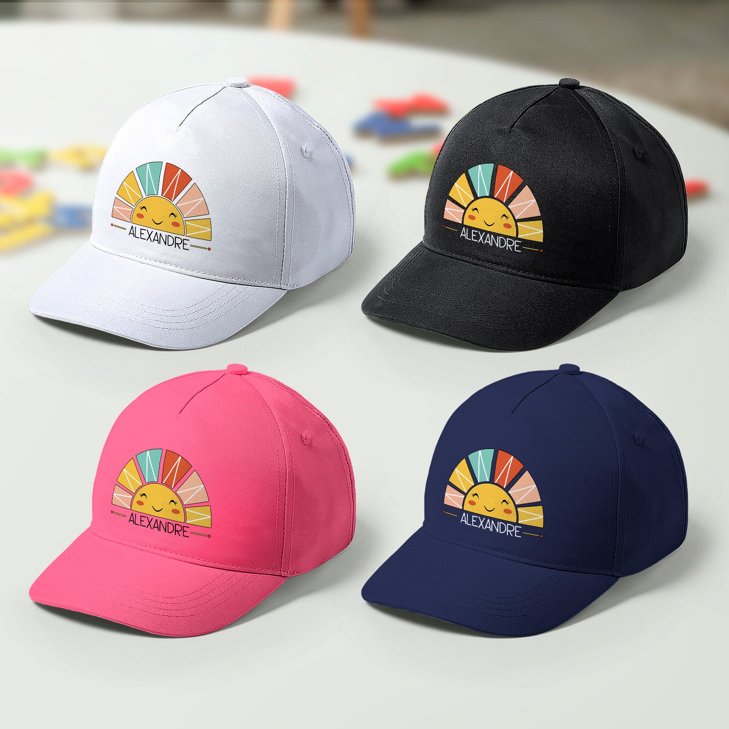 O boné "Hoje sou o sol que faz brilhar o dia" é personalizado com nome.