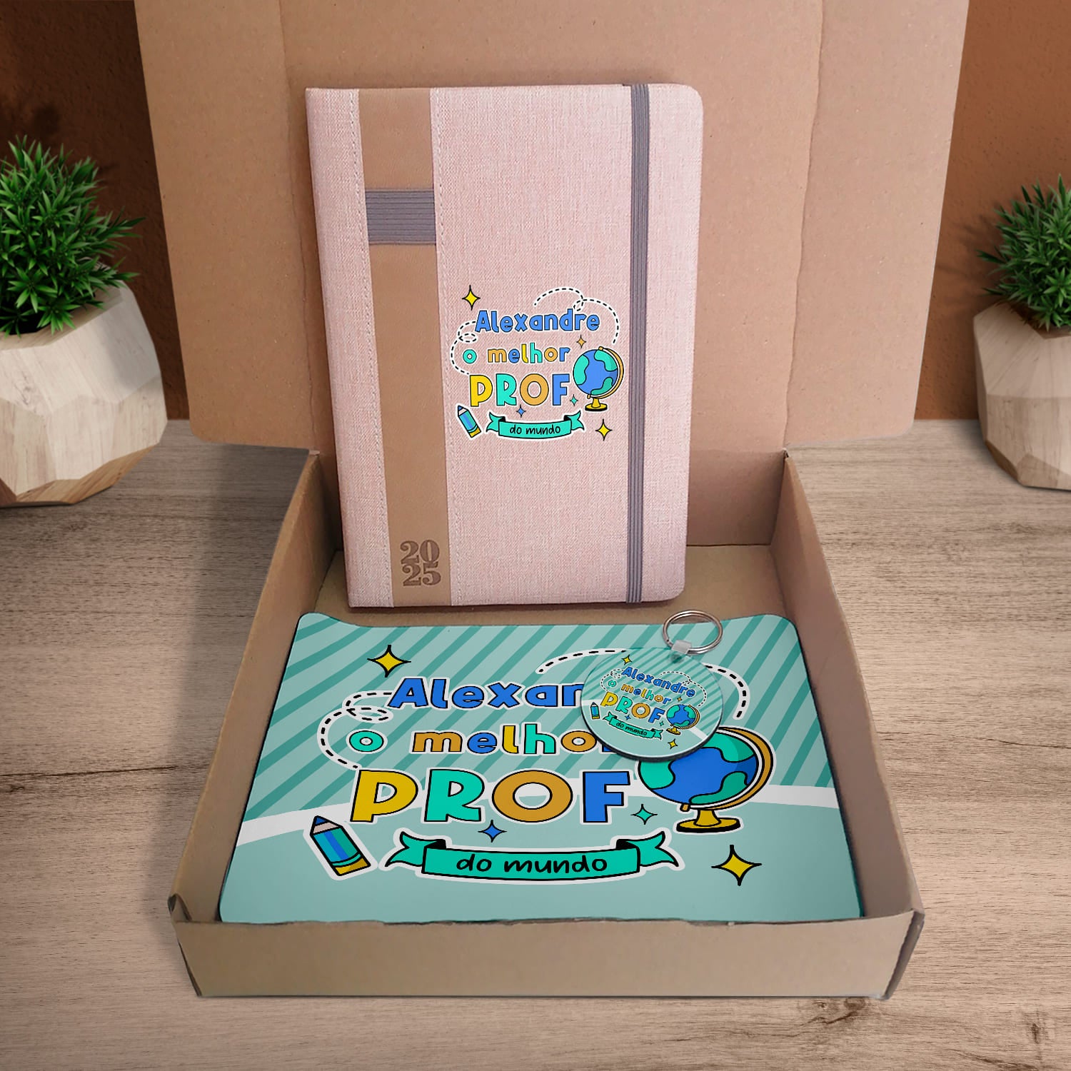 A box Agenda + Tapete de rato + Porta-chaves "Prof" é personalizada com nome.