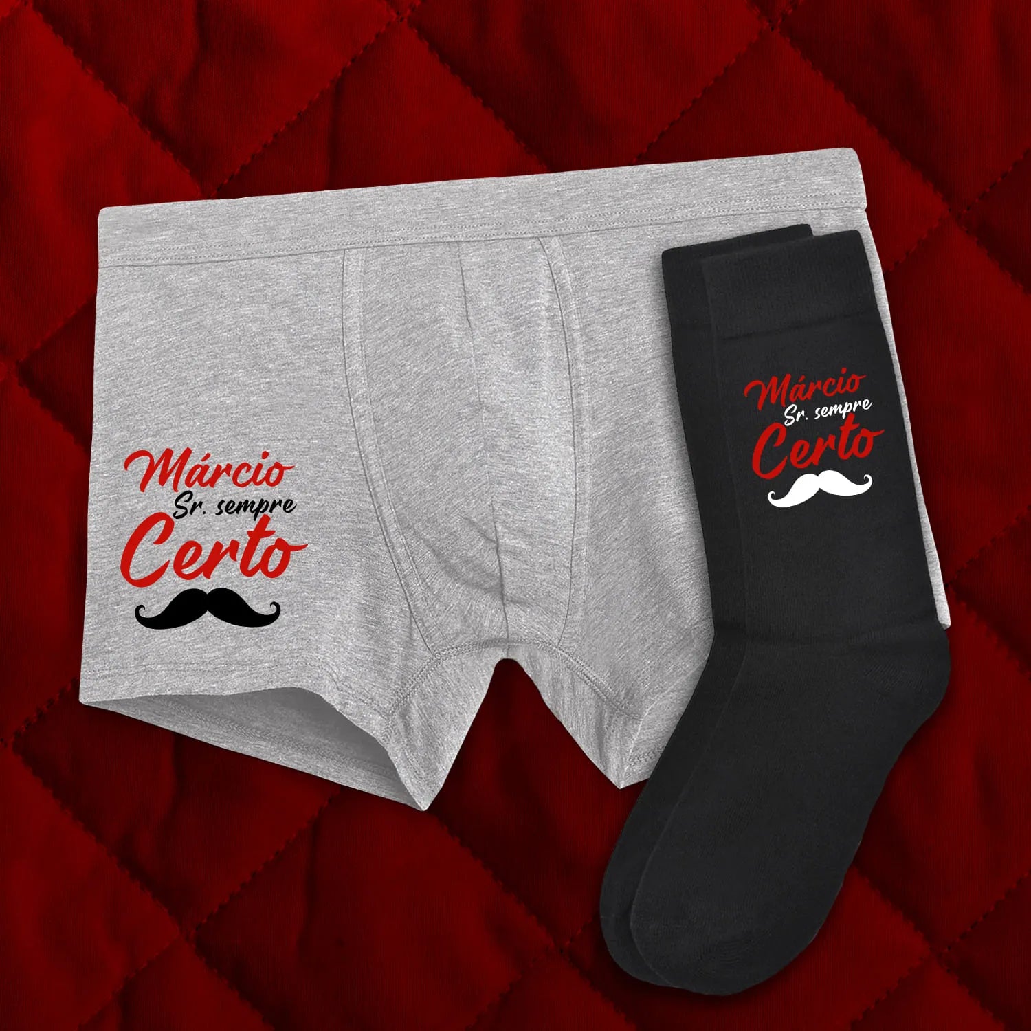 O conjunto Boxer + Meias "Sr. sempre certo" é personalizado com nome.