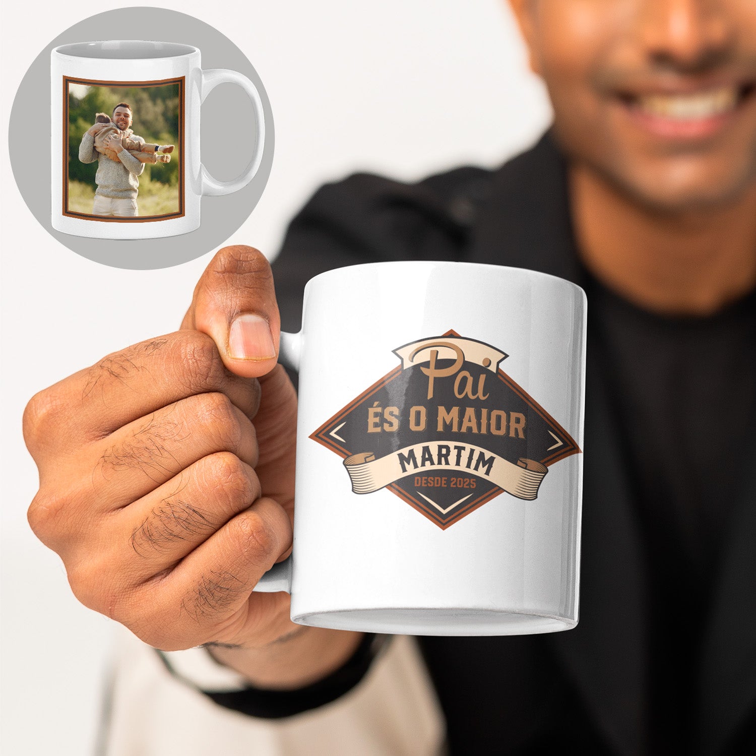 A caneca "És o Maior" é personalizada com grau de parentesco, nome, ano e fotografia.