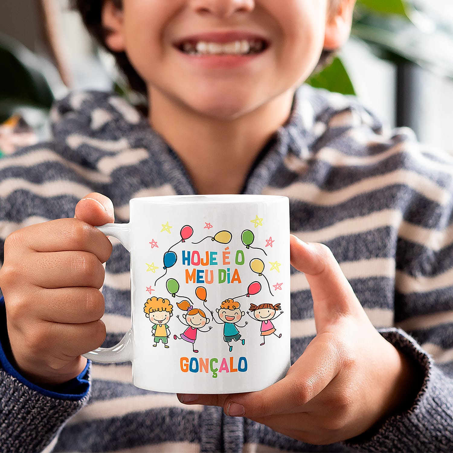 A caneca "Hoje é o meu dia" é personalizada com nome e fotografia.