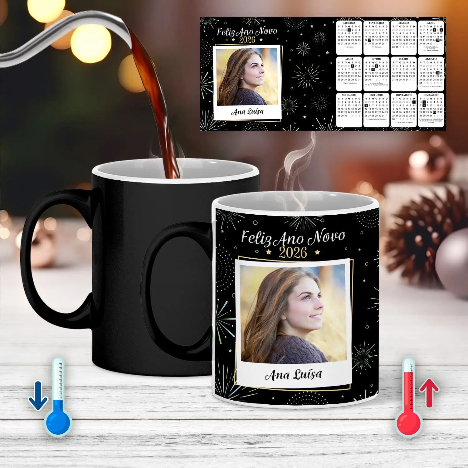 A caneca mágica "Calendário 2026" é personalizada com nome e fotografia.