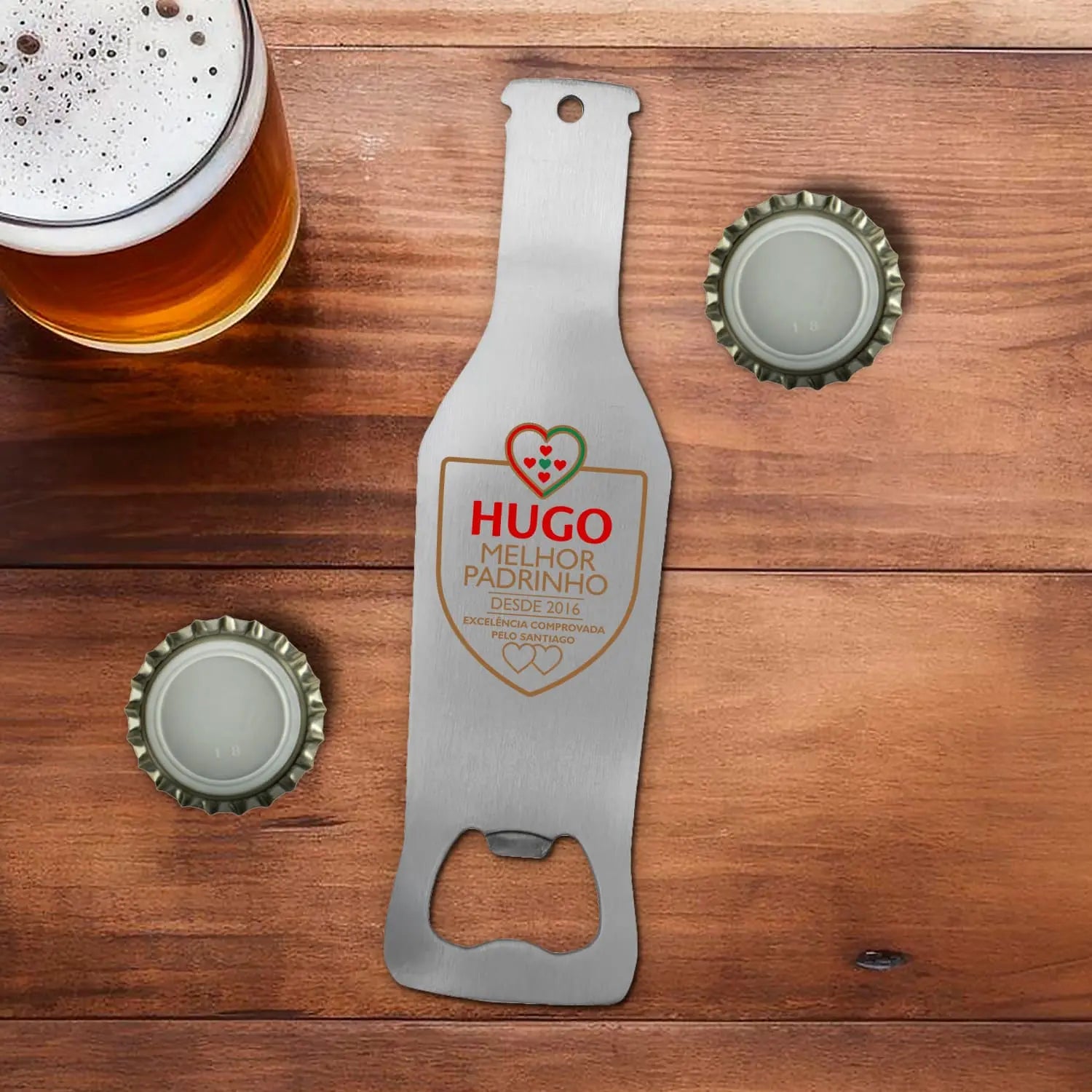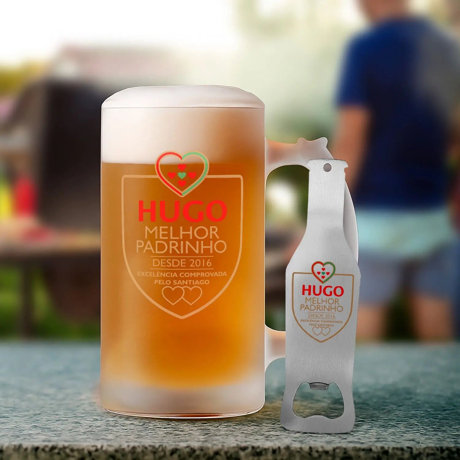 A caneca para Cerveja e o abre-garrafas "Padrinho - excelência comprovada" são personalizados com nomes e ano. Poderá ainda personalizar com o grau de parentesco pretendido (ex.: "avô”, “filho”, “padrinho”, “tio”, “marido”, …).