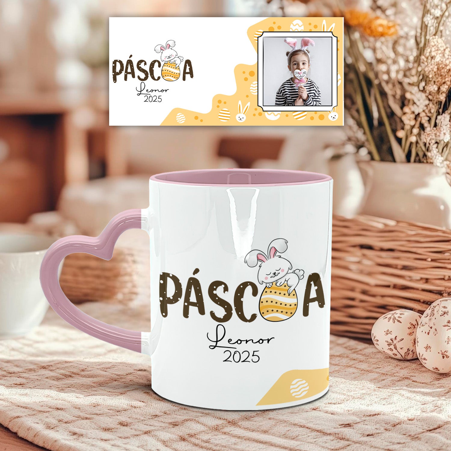 A caneca pega coração "Páscoa" é personalizada com nome, ano e fotografia.