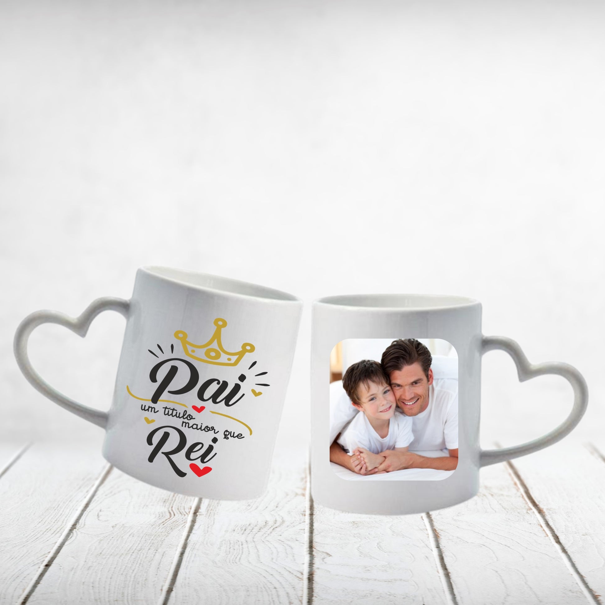 A caneca "Pai um título maior que rei" poderá ser personalizada com fotografia. Tem possibilidade de personalizar com o grau de parentesco pretendido (ex.: "pai", “avô”, “genro”, “marido”, “filho”, “sogro”, …).