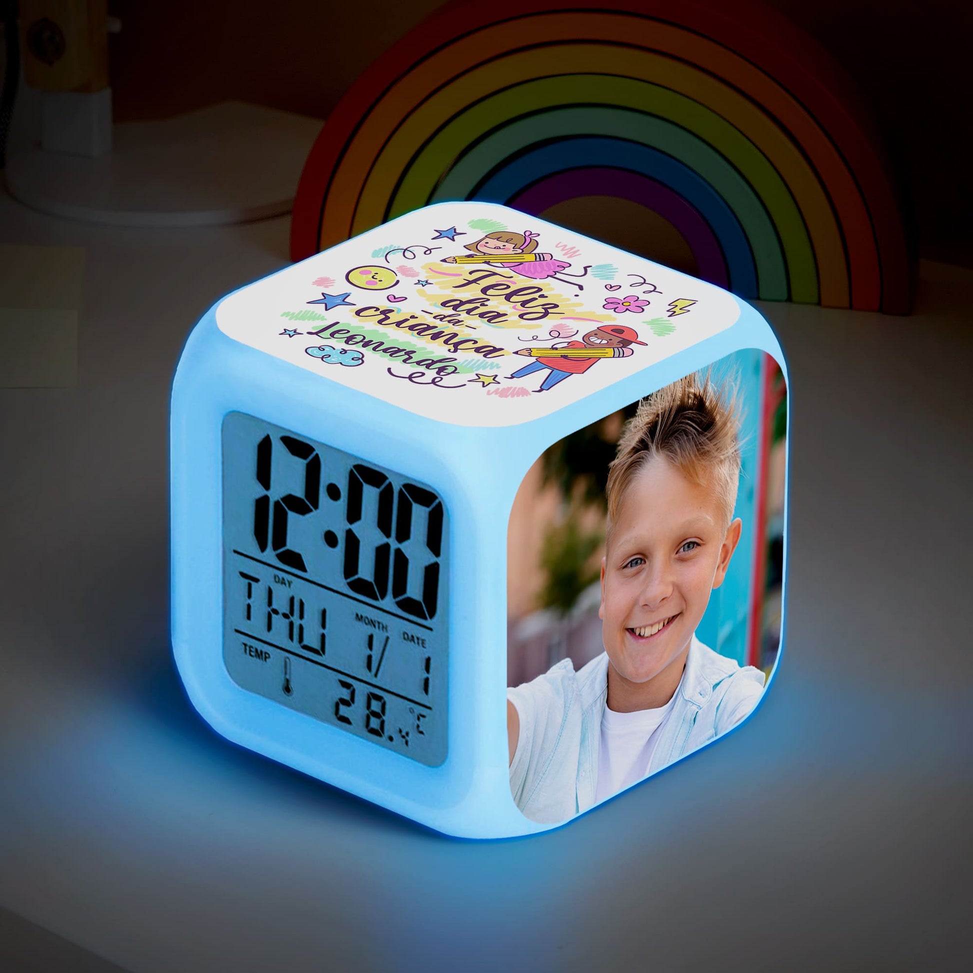 O despertador "Feliz Dia da Criança" é personalizado em 3 superfícies (2 laterais e 1 superior). A superfície superior é personalizada com nome. As superfícies laterais são personalizadas com as suas fotografias.