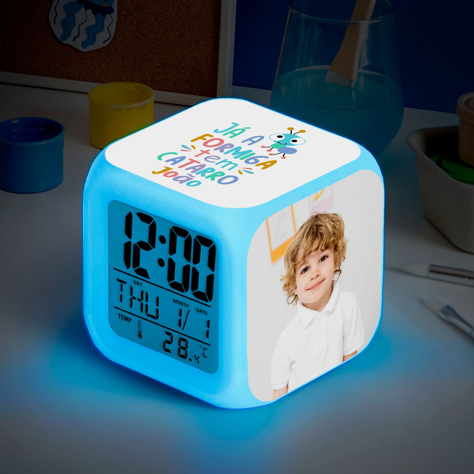 O despertador "Já a formiga tem catarro" é personalizado em 3 superfícies (2 laterais e 1 superior). A superfície superior é personalizada com nome. As superfícies laterais são personalizadas com as suas fotografias.