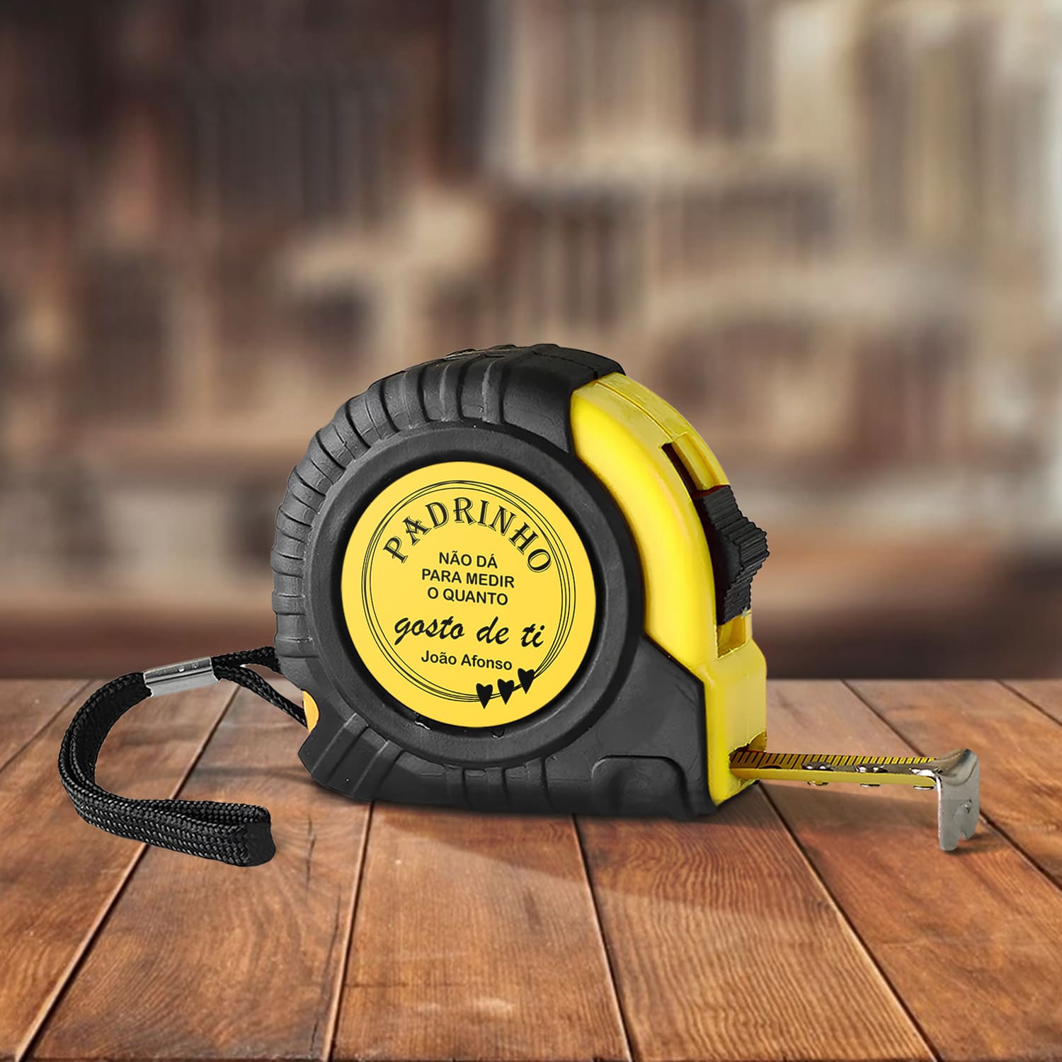 A fita métrica "Gosto de ti" é personalizada com grau de parentesco e nome.