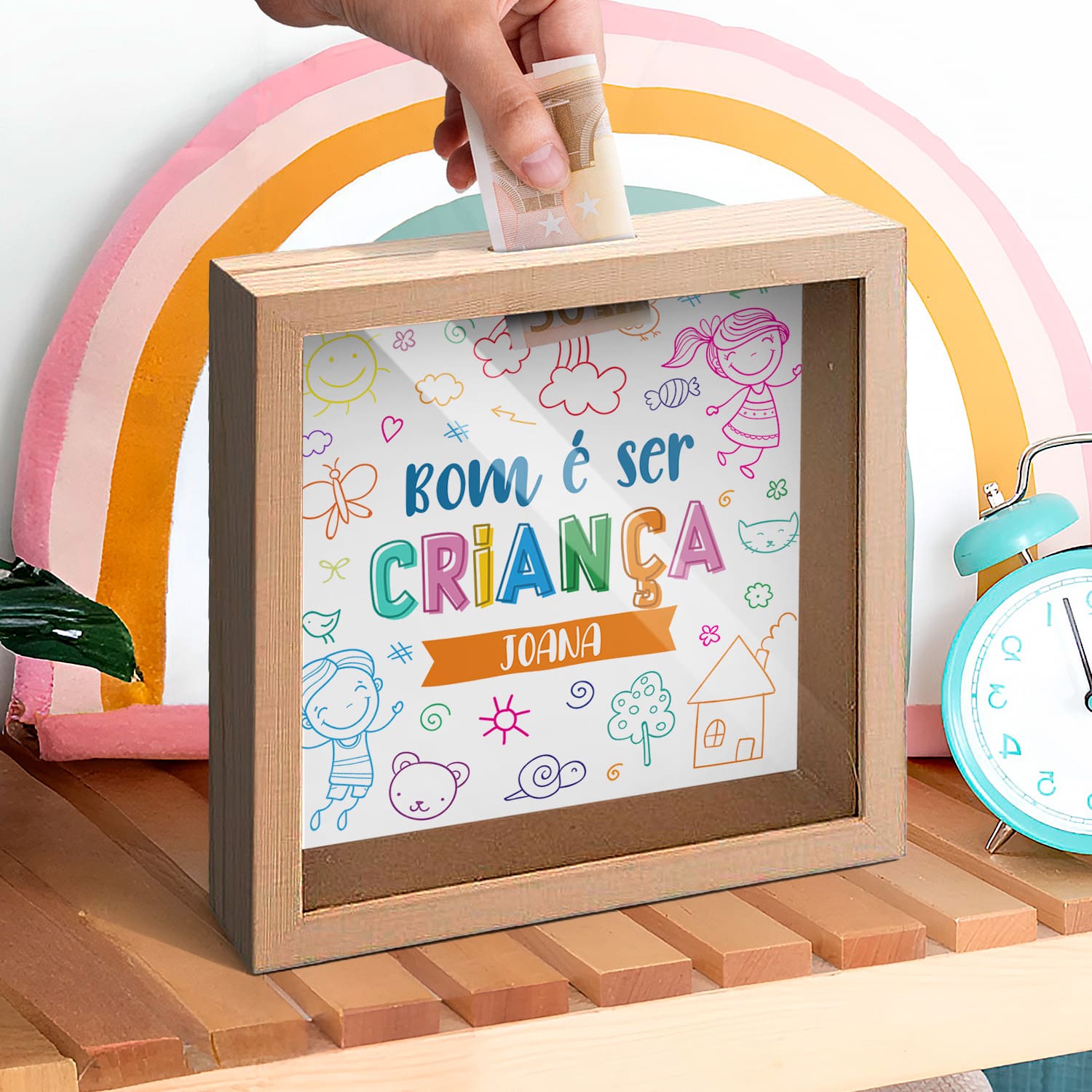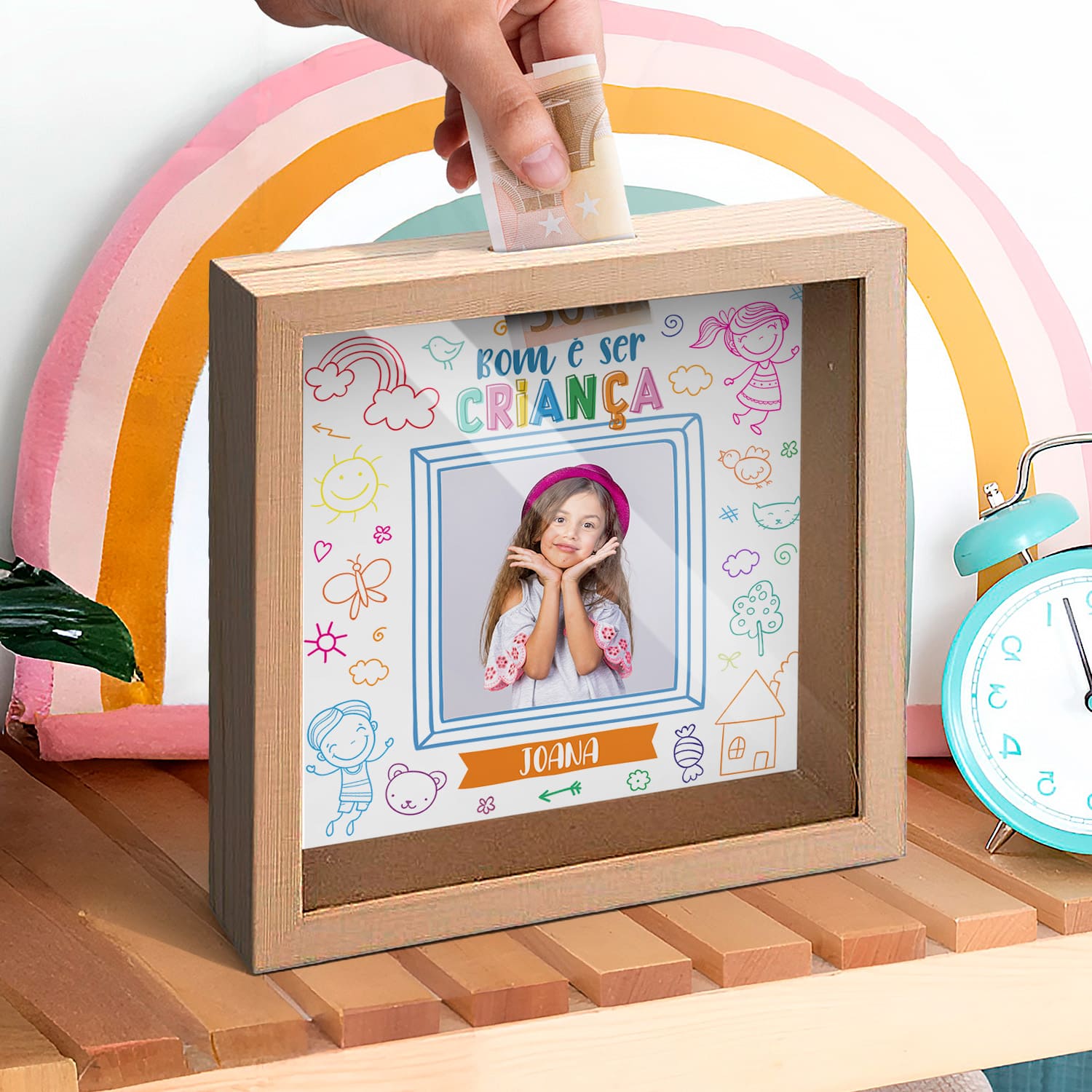 O mealheiro "Bom é ser criança" é personalizado com nome e fotografia.
