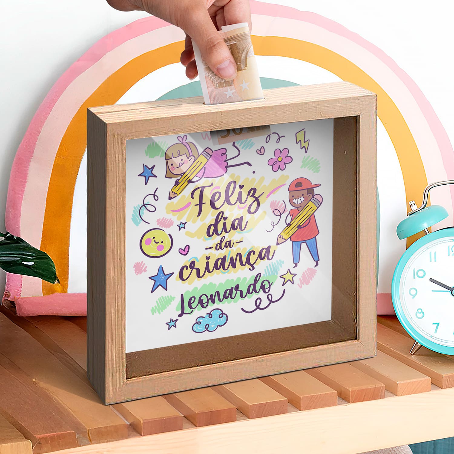 O mealheiro "Feliz Dia da Criança" é personalizado com nome.