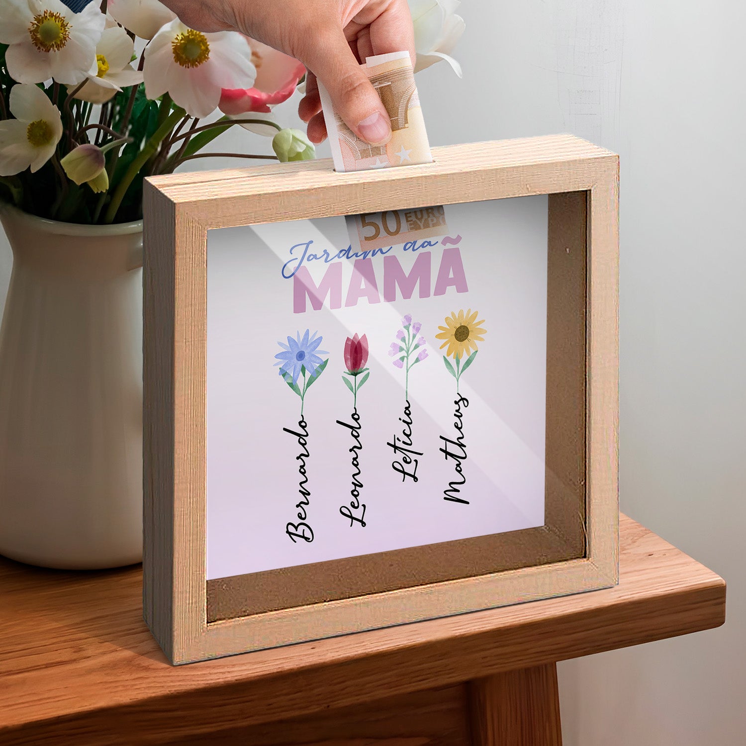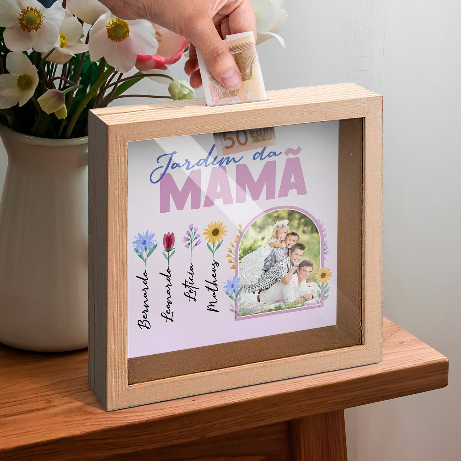 O mealheiro "Jardim" é personalizado com grau de parentesco, nome(s) e fotografia.