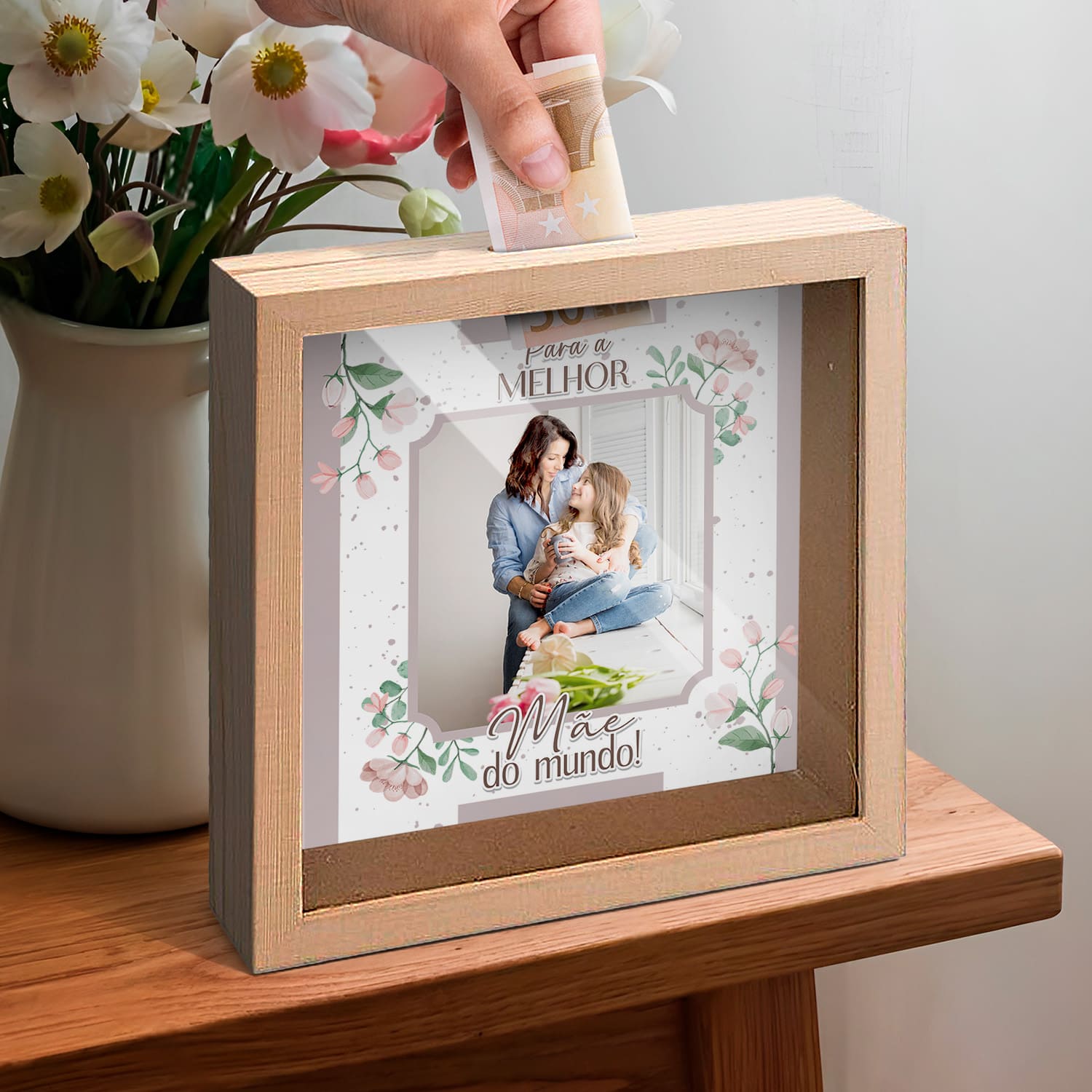 O mealheiro "Para a melhor do mundo!" é personalizado com grau de parentesco e fotografia.