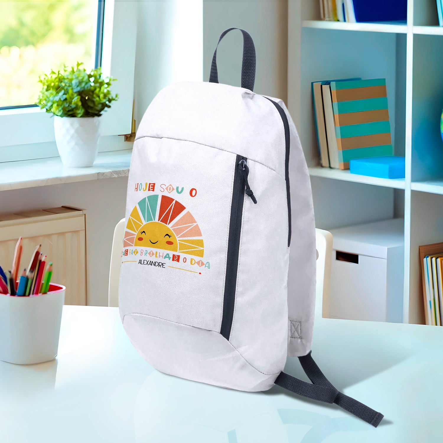 A mochila "Hoje sou o sol que faz brilhar o dia" é personalizada com nome.