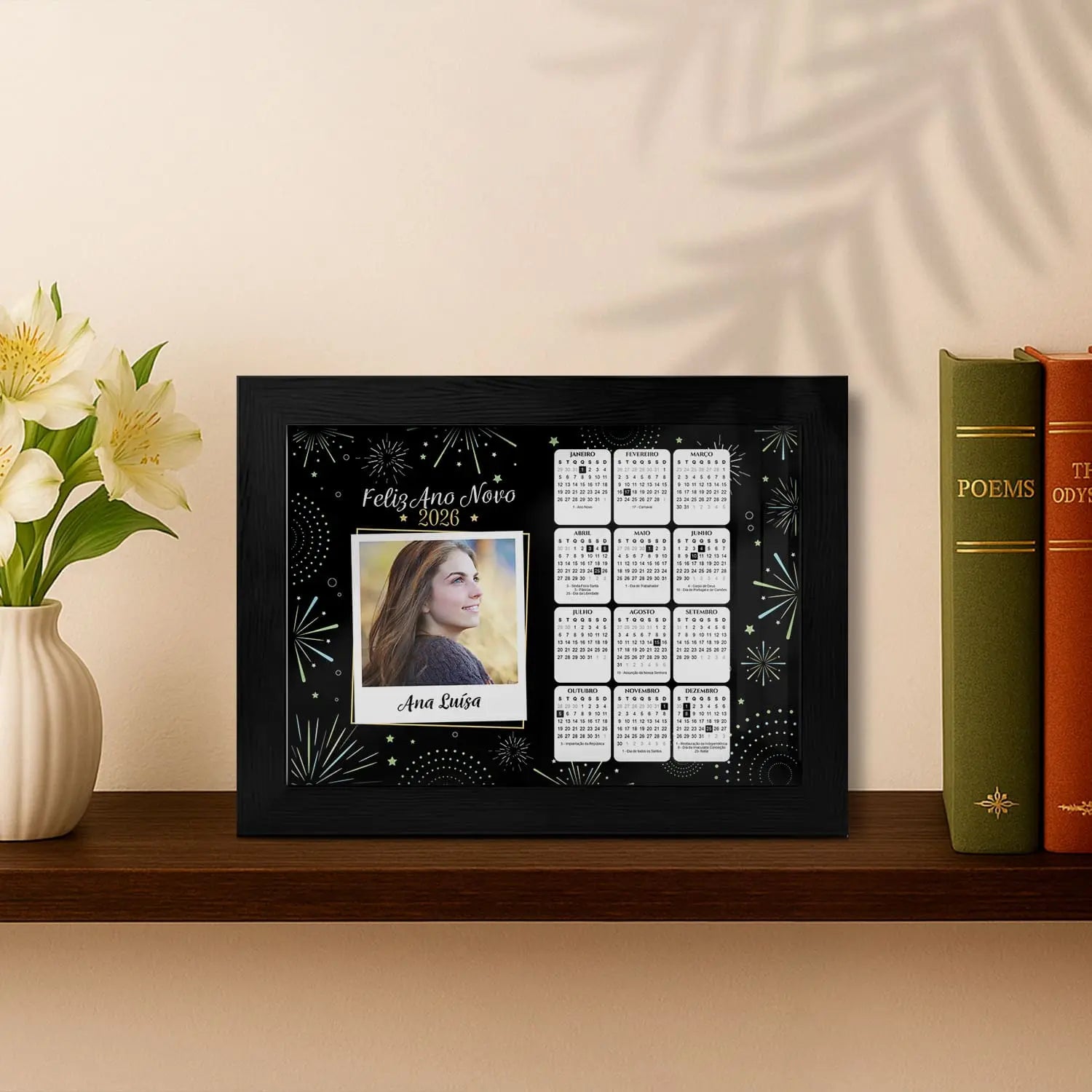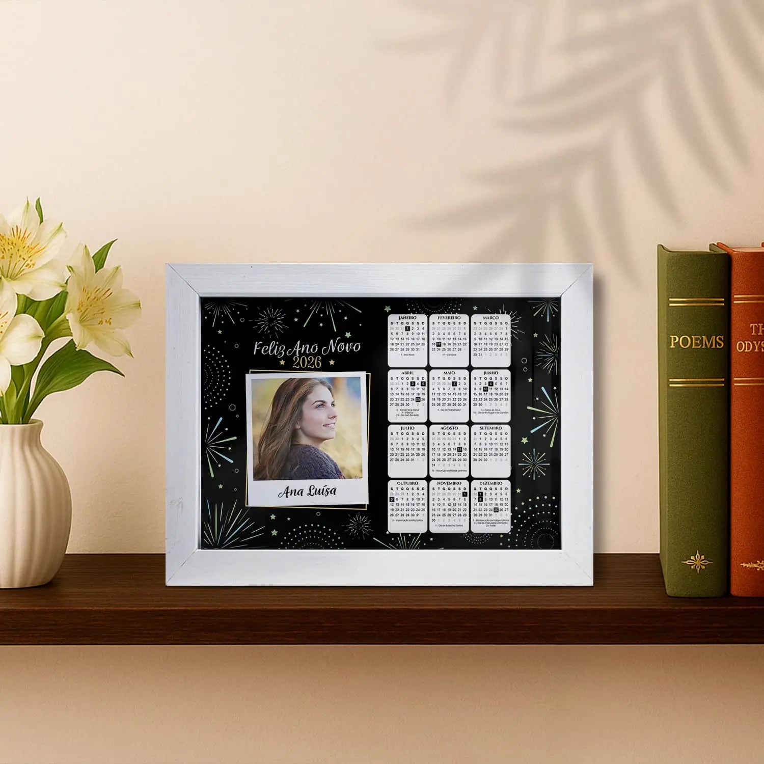 A moldura "Calendário 2026" é personalizada com nome e fotografia.