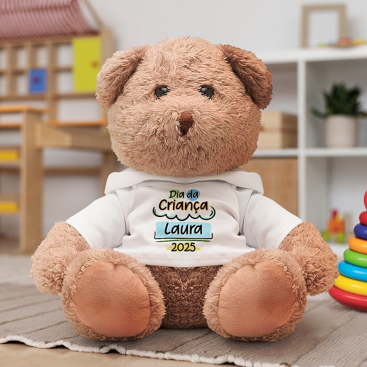 O peluche "Dia da Criança" é personalizado com nome e ano.