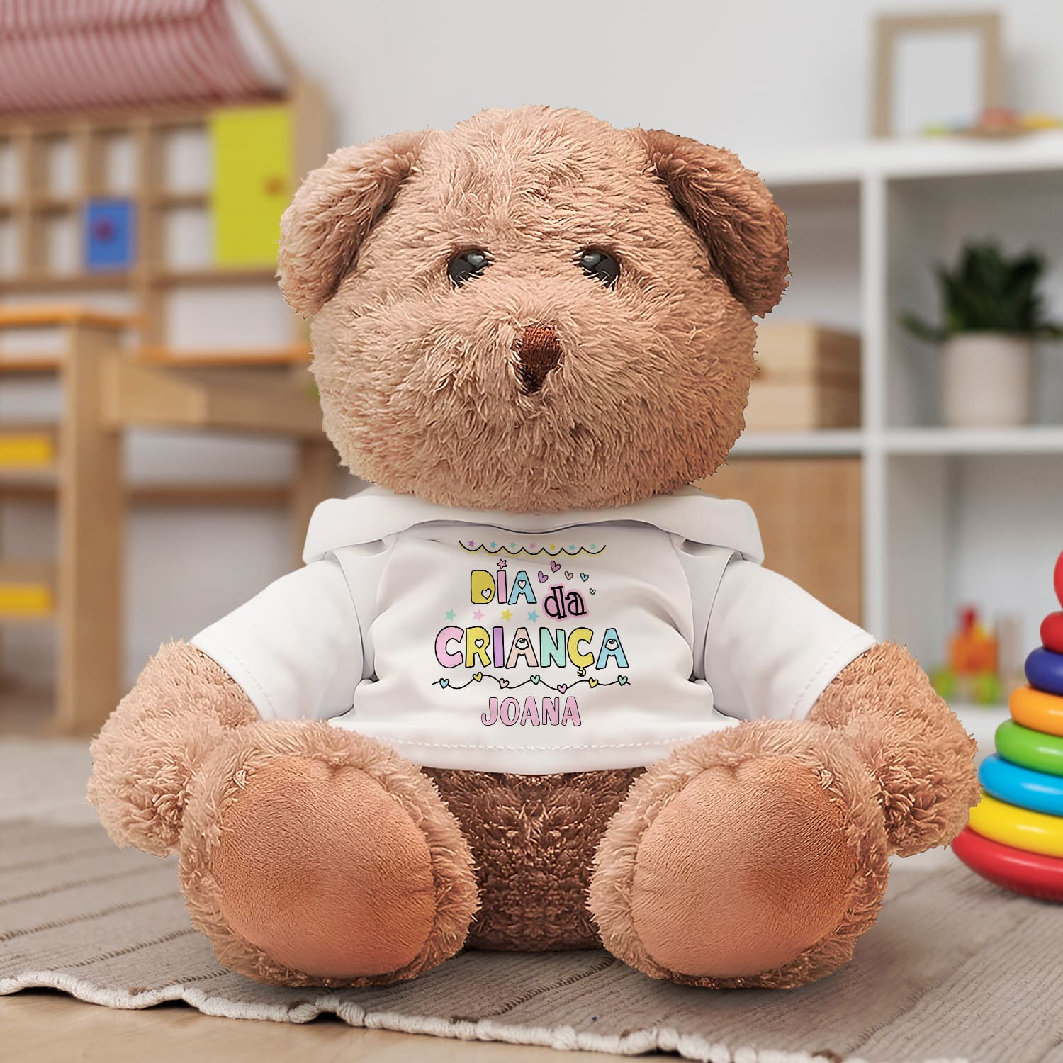O peluche "Dia Mágico" é personalizado com nome.