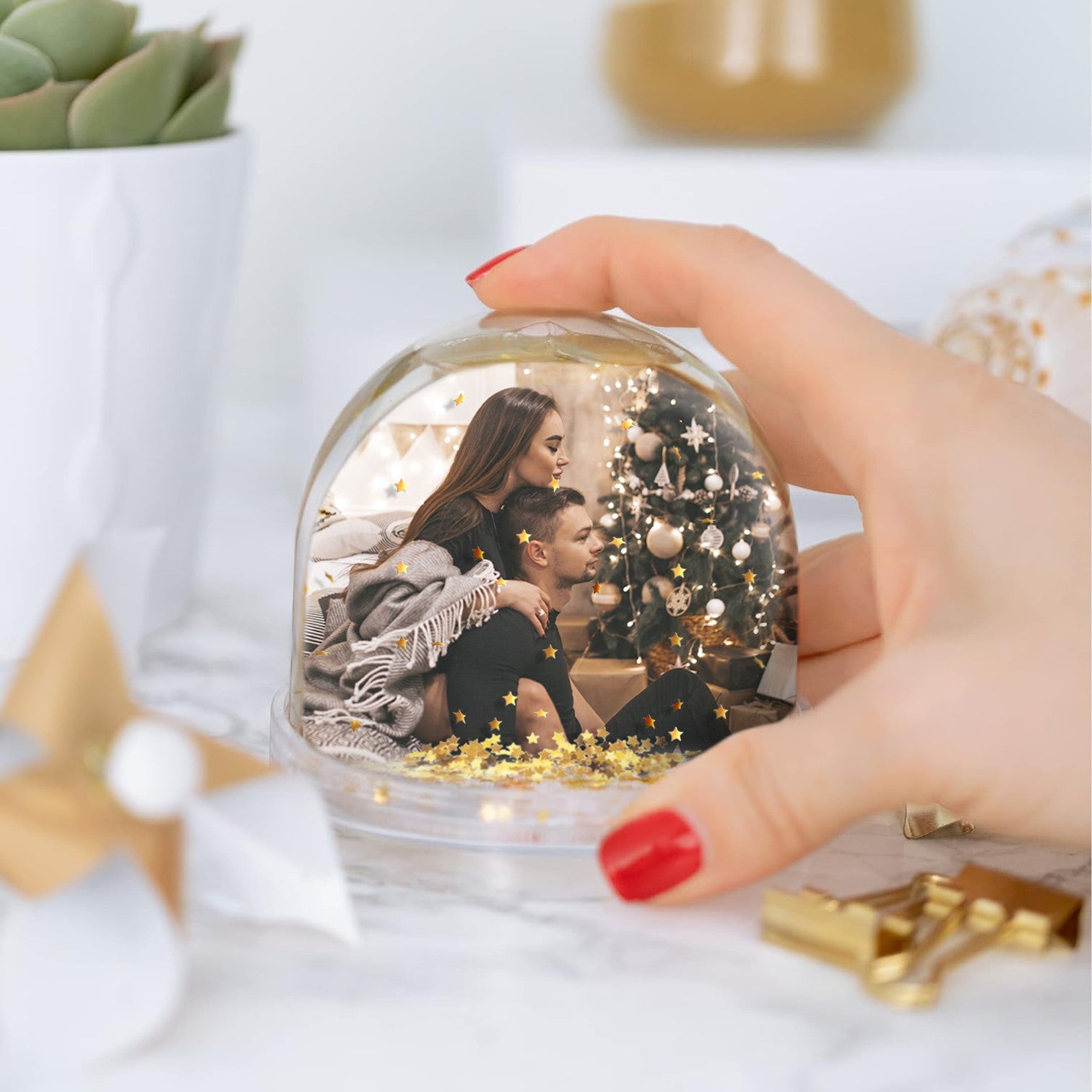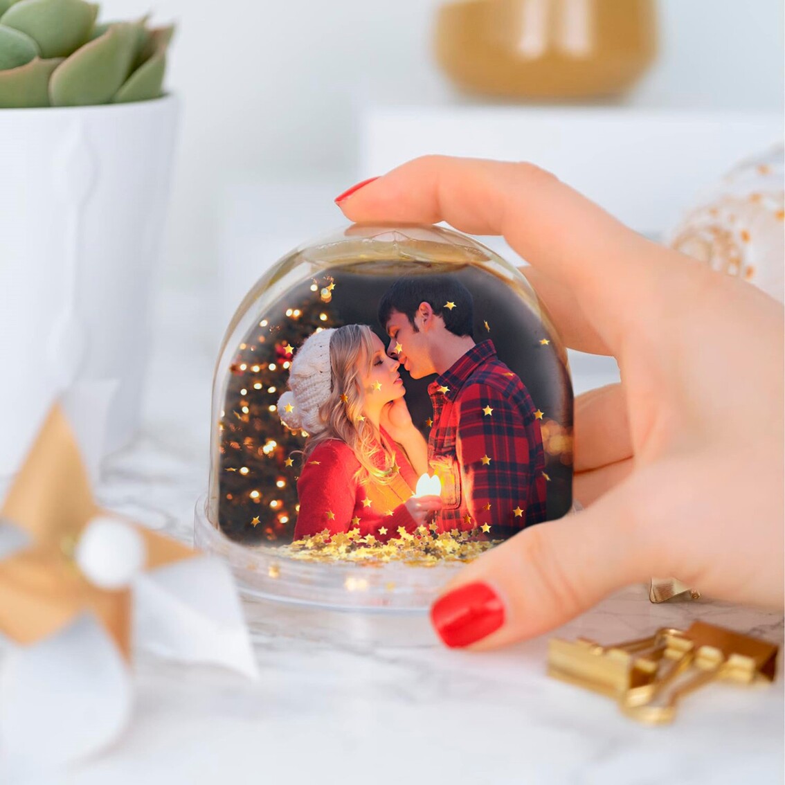 O porta-fotos "globo com estrelas" é personalizado com 2 fotografias.
