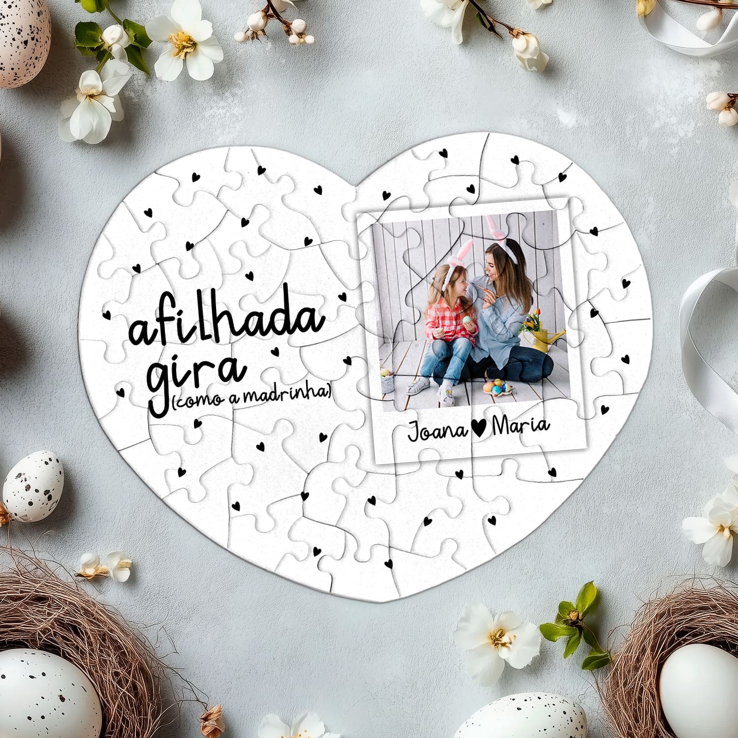 O puzzle coração "Giro(a)" é personalizado com grau de parentesco, nome(s) e fotografia.