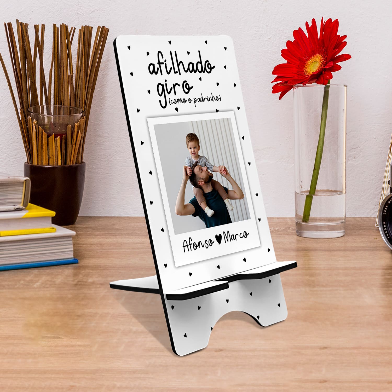 O suporte de telemóvel "Giro(a)" é personalizado com grau de parentesco, nome(s) e fotografia.
