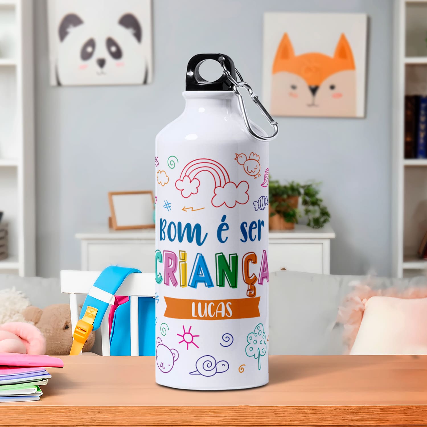 A t-shirt e garrafa "Bom é ser criança" são personalizadas com nome.