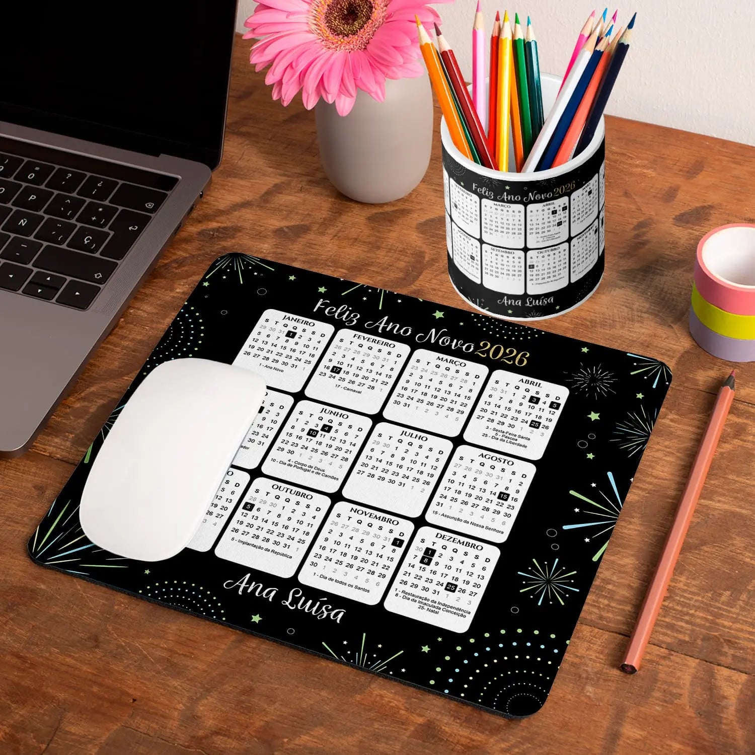 O tapete de rato e/ou o porta-lápis "Calendário 2026" são personalizados com nome.