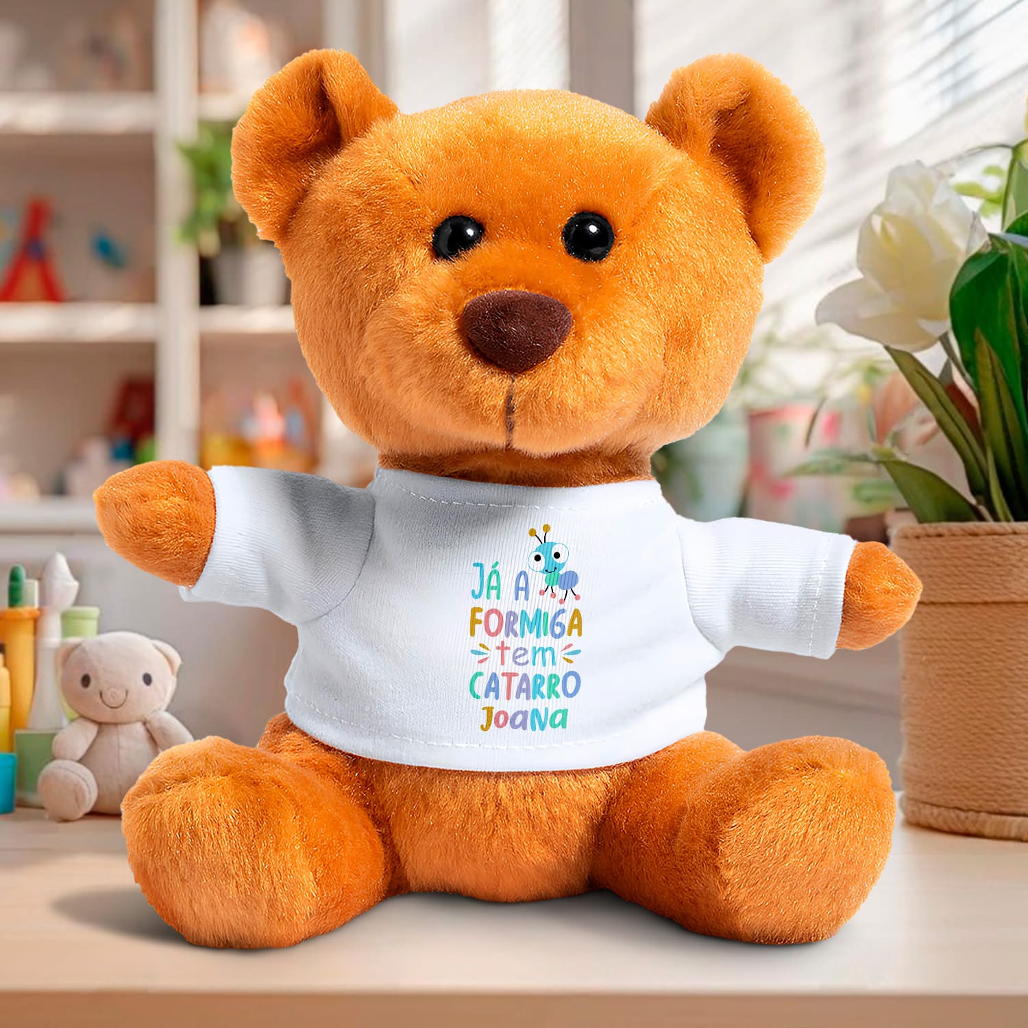O ursinho "Já a formiga tem catarro" é personalizado com nome.