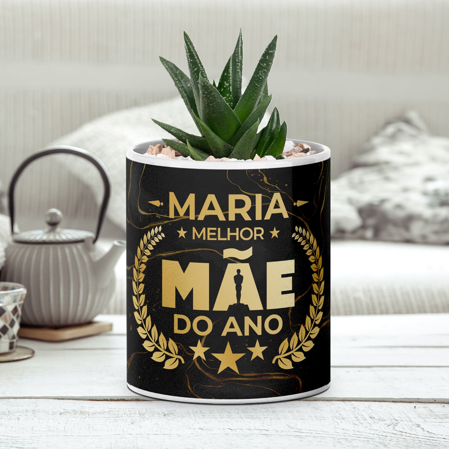 O vaso "Óscar: melhor mãe do ano" é personalizado com nome(s).