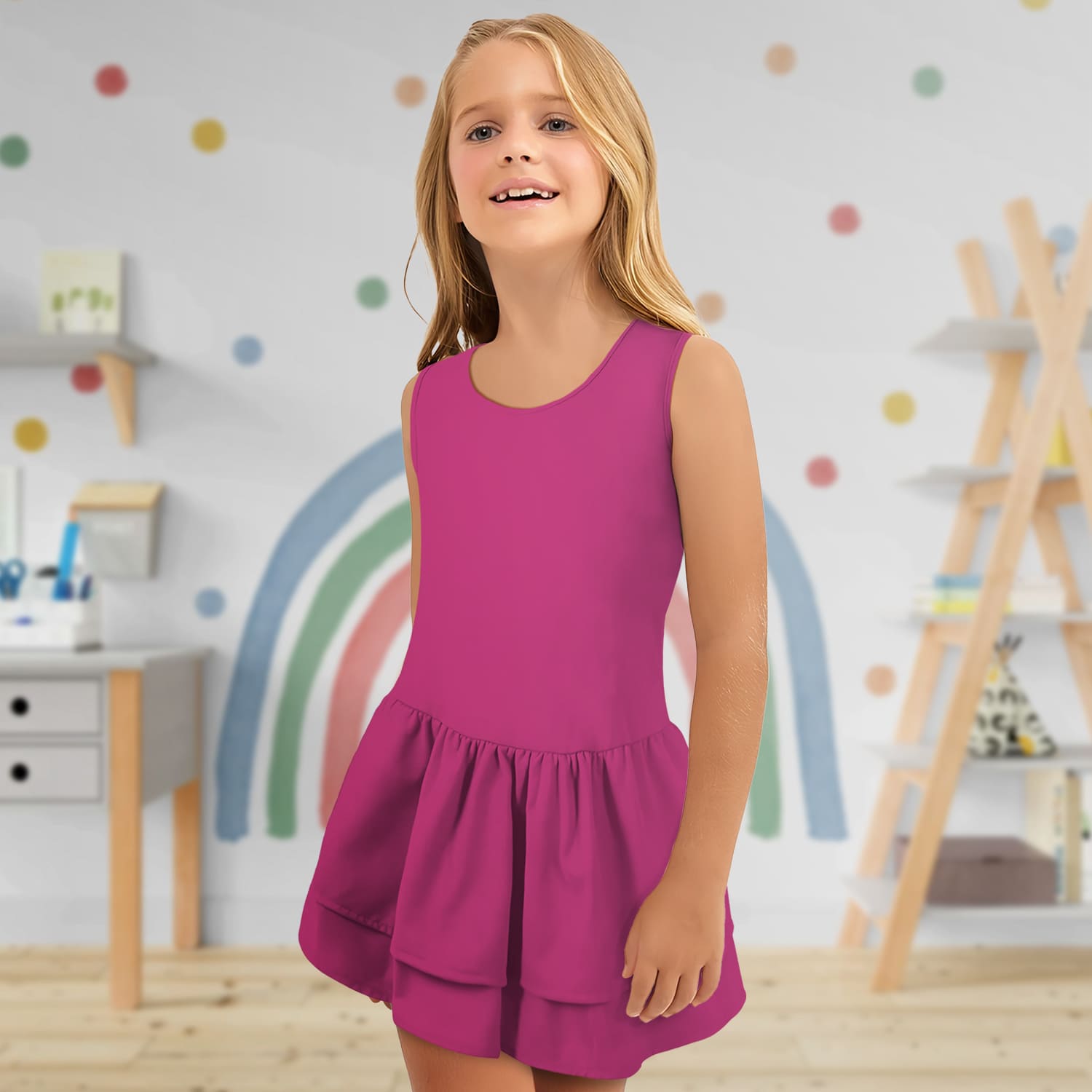 . Vestido infantil sem mangas com gola redonda e saia dupla.