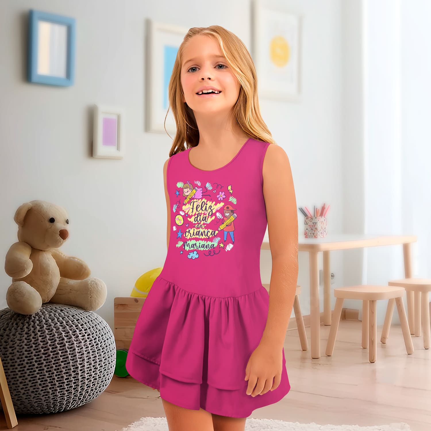 O vestido e a garrafa "Feliz Dia da Criança" são personalizados com nome.
